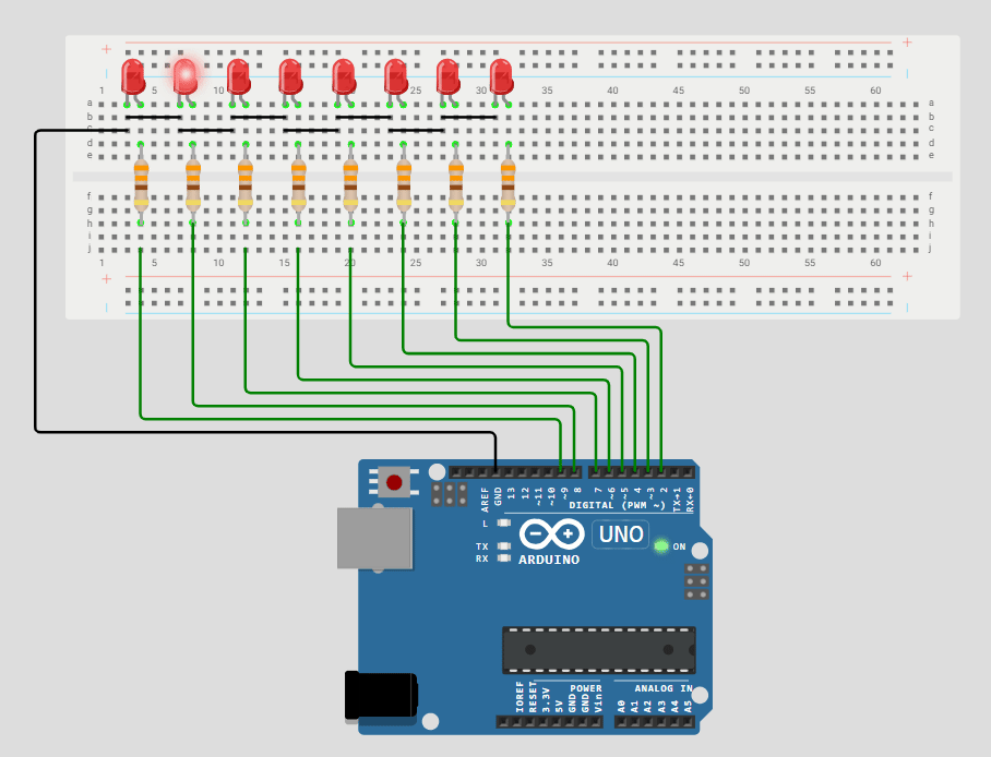 - Arduino’nun 2-9 numaralı dijital pinlerine LED’leri bağlayın.
