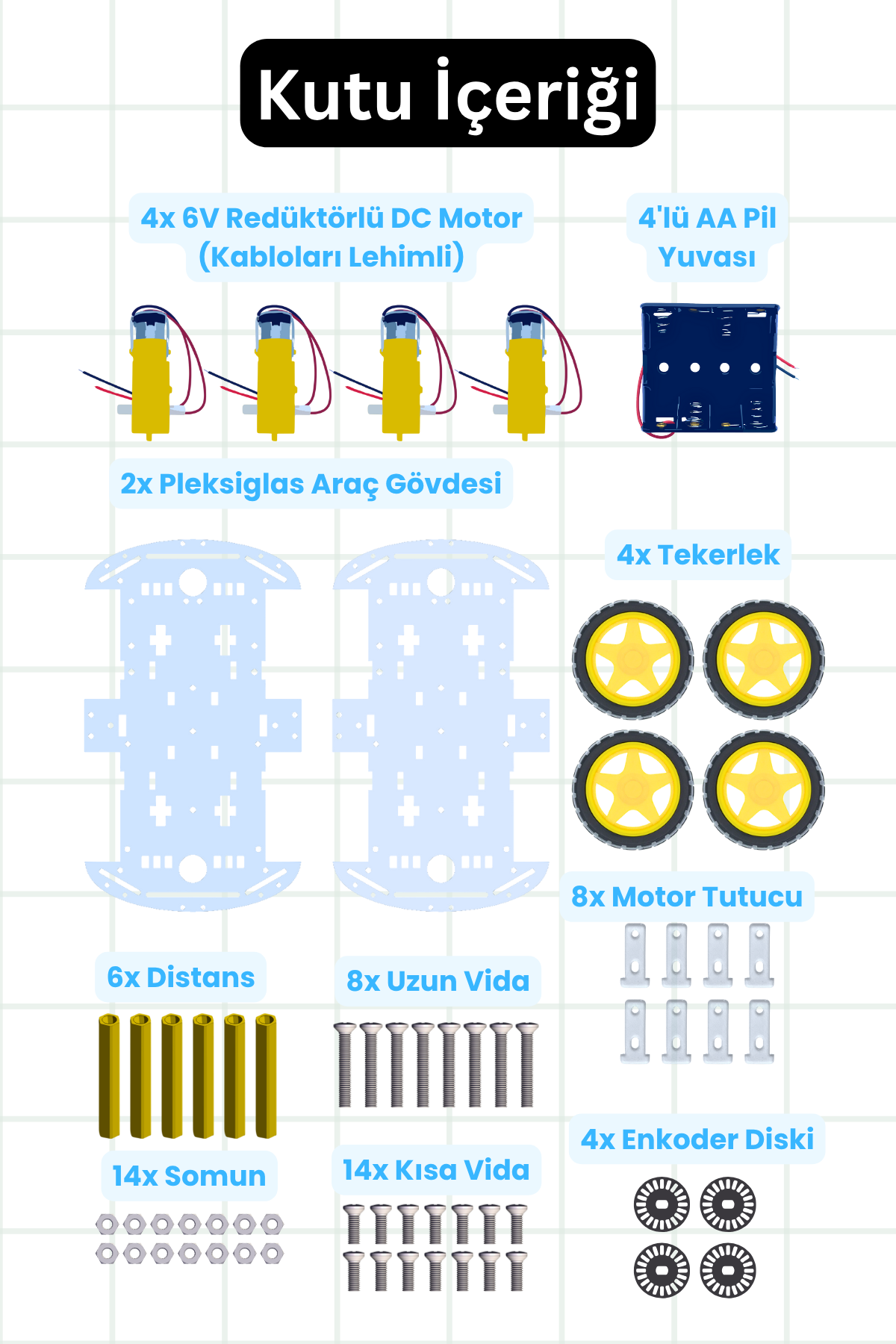 - Platform Alanı: Arduino, L298N, sensör modülleri, batarya kutusu gibi bileşenleri rahatlıkla yerleştirebilirsiniz.