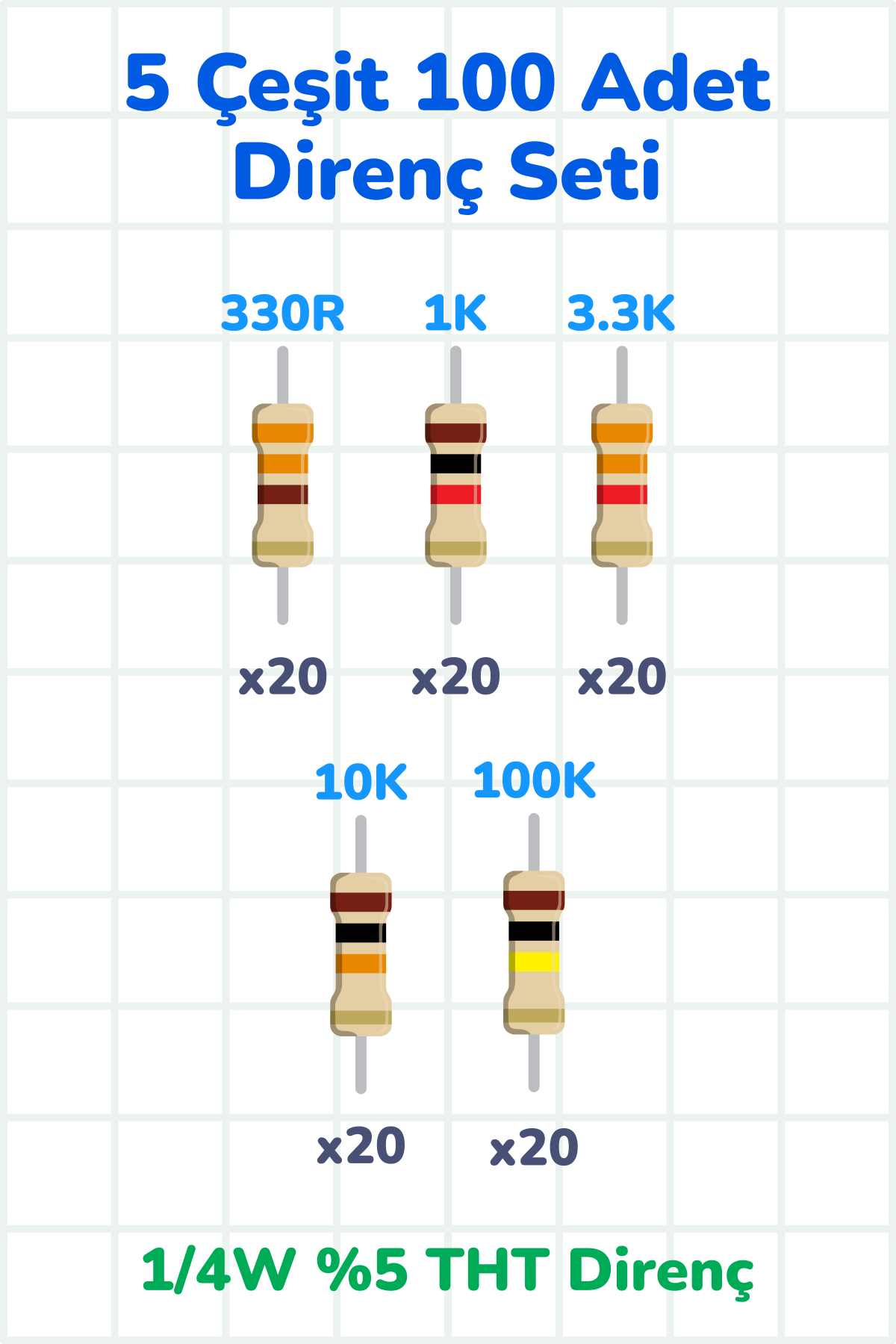 Bu set, elektrik ve elektronik projelerinde en sık kullanılan 10 farklı direnç değerini içerir ve toplamda 200 adet dirençten oluşur. Her bir direnç değerinden 20’şer adet yer almakta olup, her atölyede bulunması gereken temel bileşenler arasında yer alır.