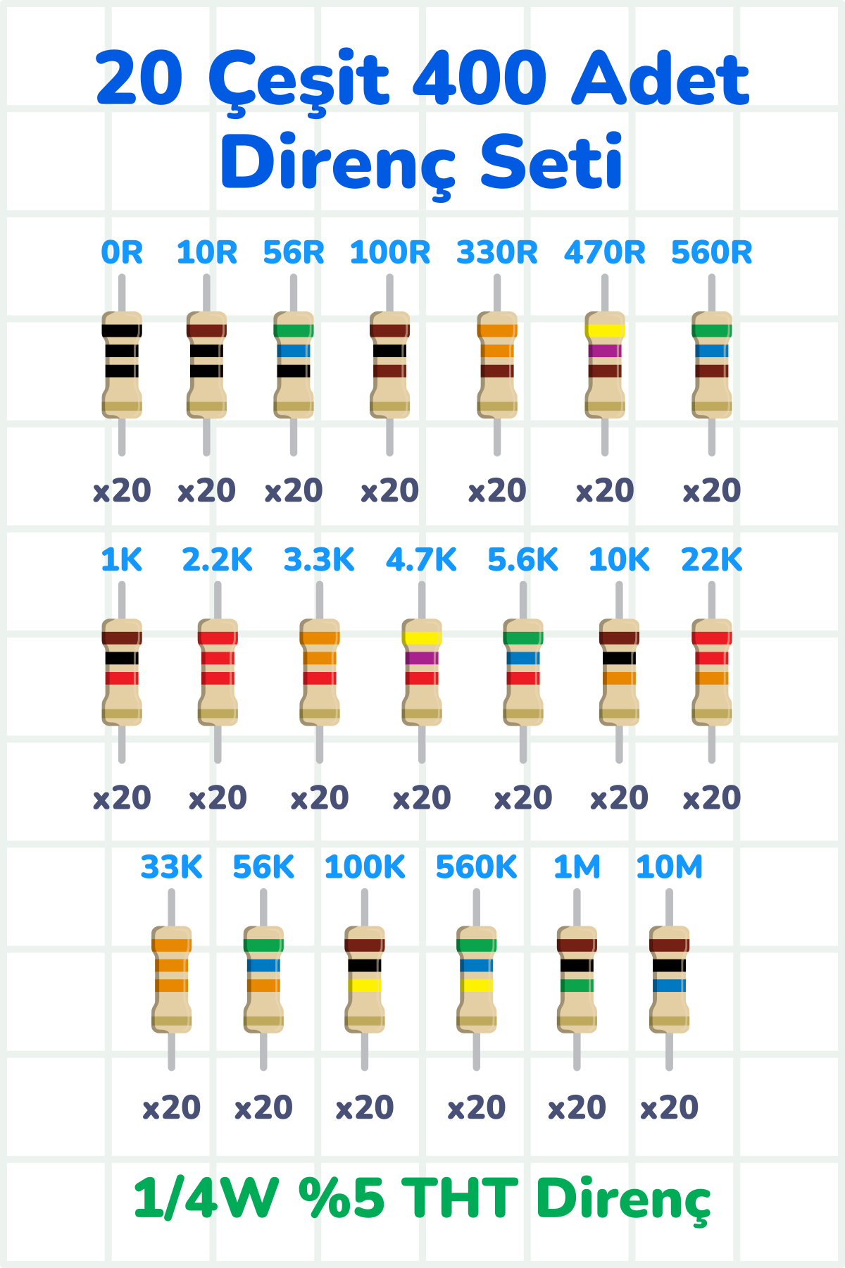 Direnç Seti 1/4W %5 400 Parça 20 Çeşit | 0R 10R 56R 100R 330R 470R 560R 1K 2.2K 3.3K 4.7K 5.6K 10K 22K 33K 56K 100K 560K 1M 10M